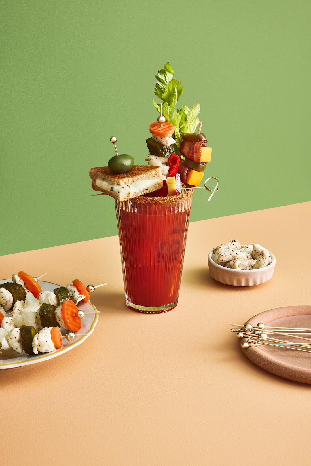 Est-ce un cocktail? Est-ce une entrée? Une chose est sûre, c’est un Bloody qui déborde de fromages d’ici! Peu importe comment on l’appelle, cette idée fera rêver votre brochette d’invités.