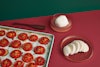 Couper des tranches de tomate de 2 cm d’épaisseur et les disposer sur un papier parchemin placé sur une plaque à cuisson.