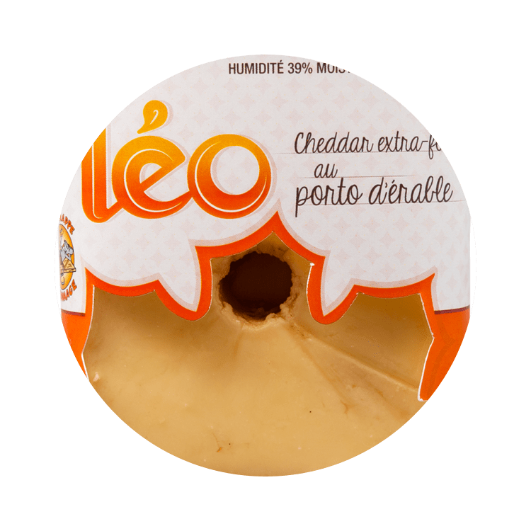 Ce fromage à pâte ferme affiné en surface est fait à 100 % de lait pasteurisé provenant de fermes laitières de l’Outaouais, sans ajout de substances laitières modifiées. Il s’agit d’un cheddar extra-fort vieilli 2 ans et macéré au porto à l’érable, le porto Charles Aimé Robert du Domaine Acer. Sa pâte légèrement friable, d’une couleur de beurre salé aux reflets bourgogne, présente un goût agréablement doux en bouche, bien complimenté des saveurs distinctives du porto. Le Léo est tout à fait unique en son genre.