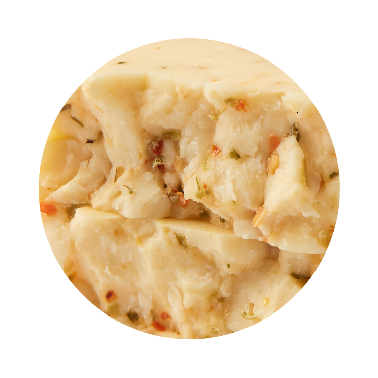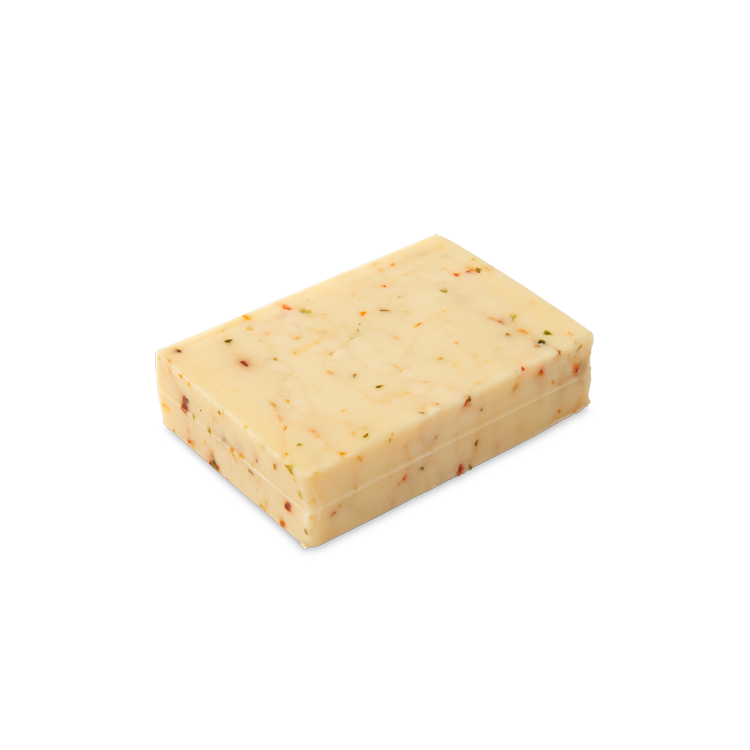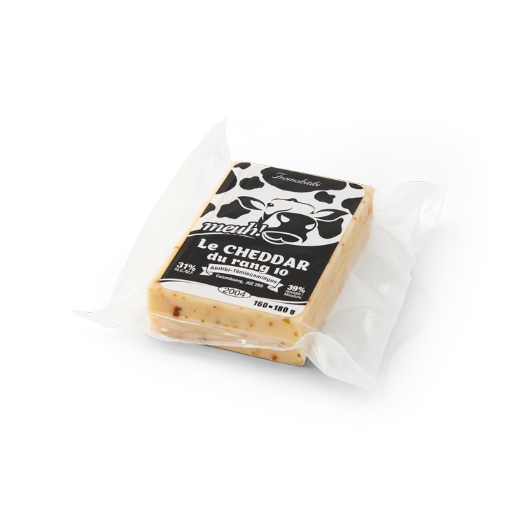 Fait de lait pasteurisé, Le fromage Cheddar du Rang 10 aromatisé aux légumes est idéal pour rehausser vos salades ou pour être dégusté en collation.