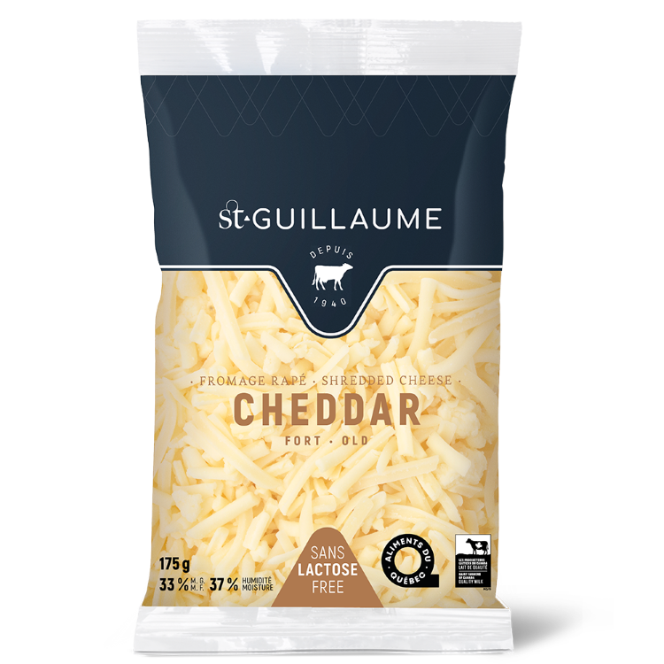 Le Cheddar Fort St-Guillaume Vieilli 1 an est un fromage sans lactose fait de lait thermisé et possède une pâte ferme sans croûte. Il est offert en bloc, râpé ou en tranche.