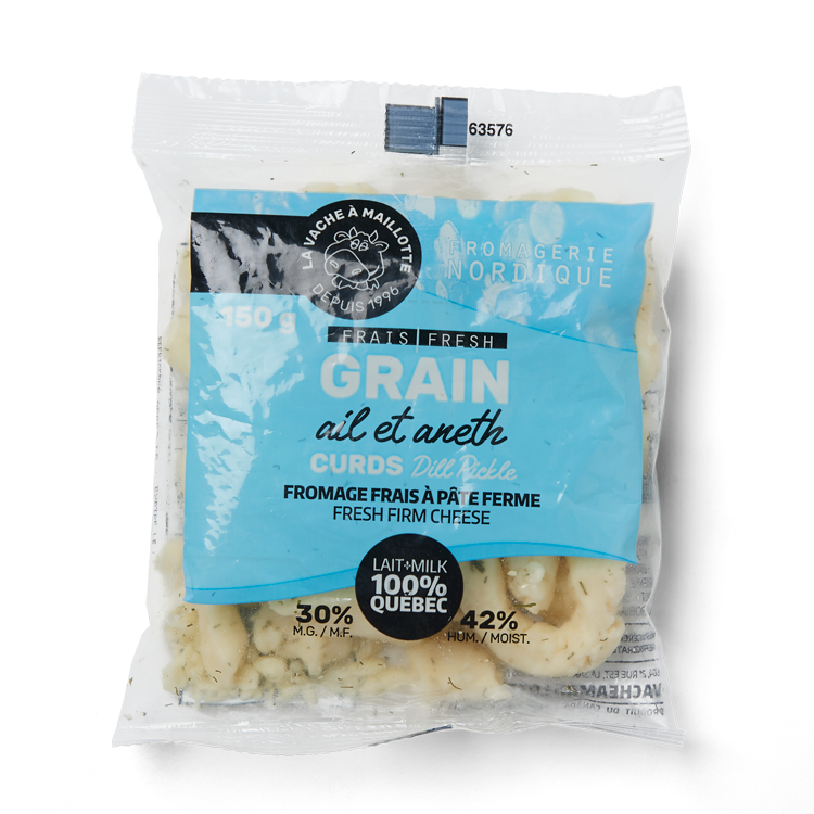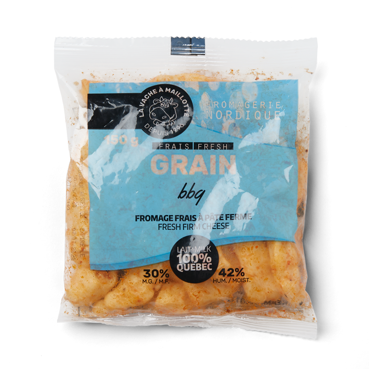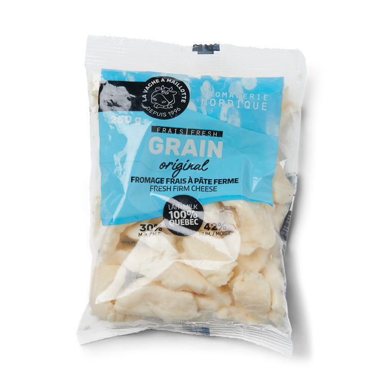 Le Cheddar Vache à Maillotte Original est savoureux, tendre et toujours frais, vous raffolerez de sa texture et de sa douce saveur. Il est idéal en collation. Le cheddar en grains est également offert en d'autres saveurs: au BBQ ainsi qu'à l'ail et aneth.