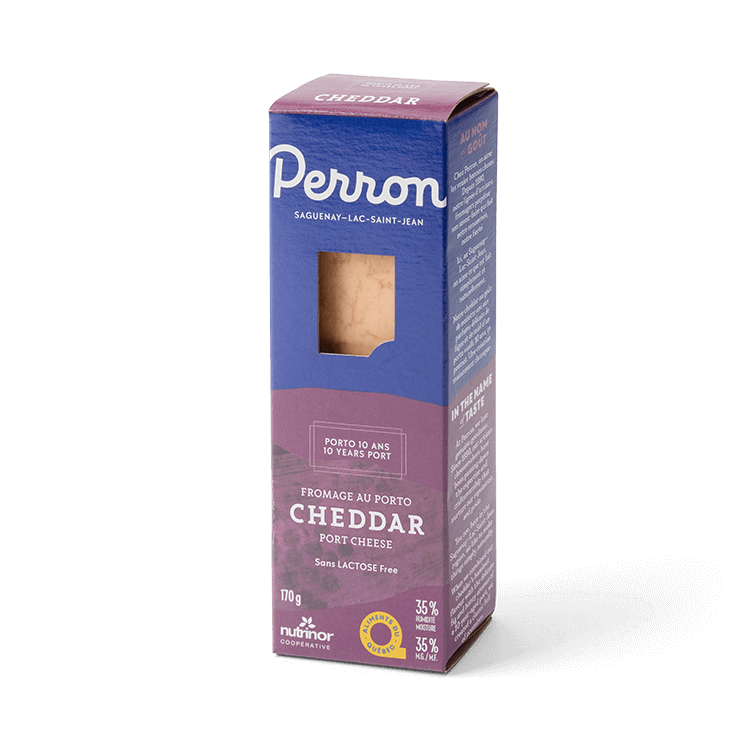 Le Cheddar Perron au Porto est macéré et affiné en surface avec un porto de 10 ans et vieilli de 6 à 9 mois. Ce fromage à pâte ferme, pressée et non cuite, est fait de lait entier thermisé.