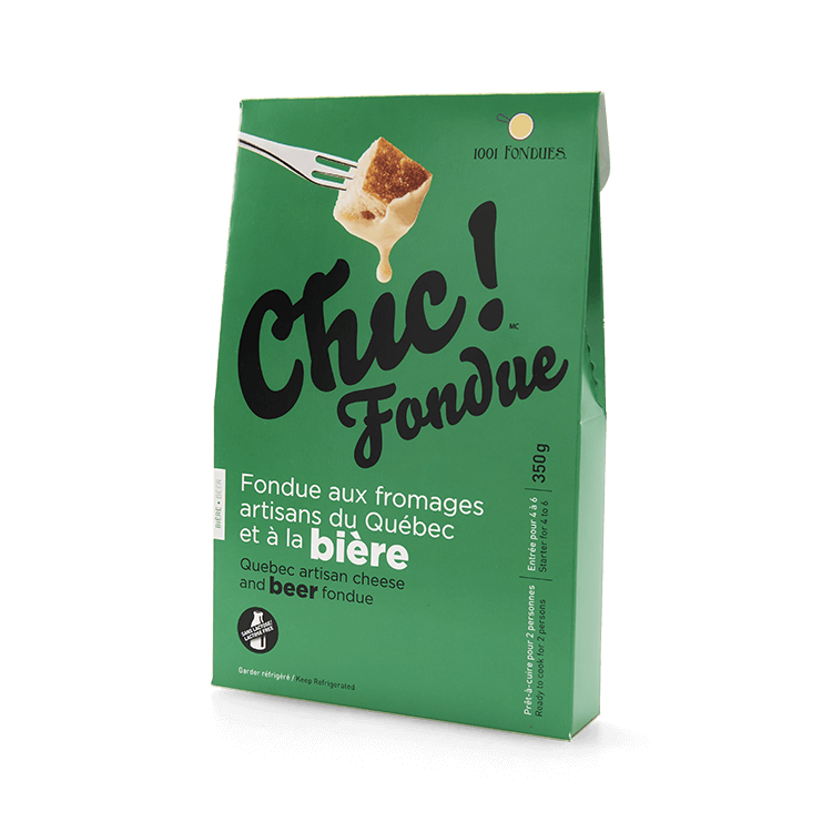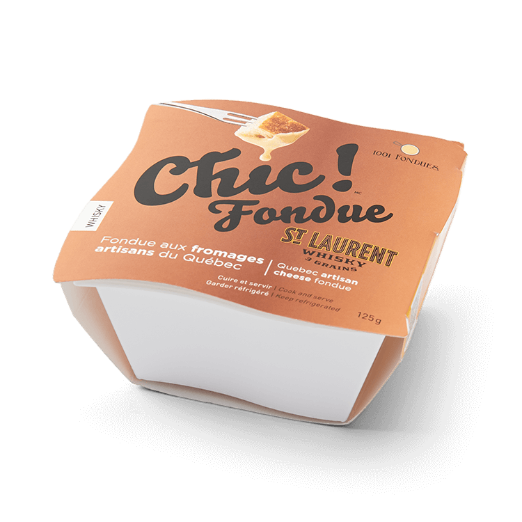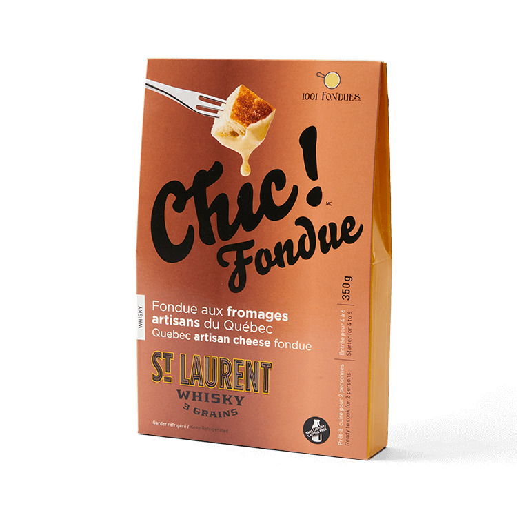 Concoctée avec le fameux Whisky 3 grains de la Distillerie du St. Laurent, cette fondue aussi audacieuse que délicieuse présente des saveurs corsées, longues et onstueuses. Les fromages qui la composent proviennent de la Fromagerie de l'Isle, la Fromagerie Perron et Fromage au Village. Disponible en format snack, la fondue est sans lactose.