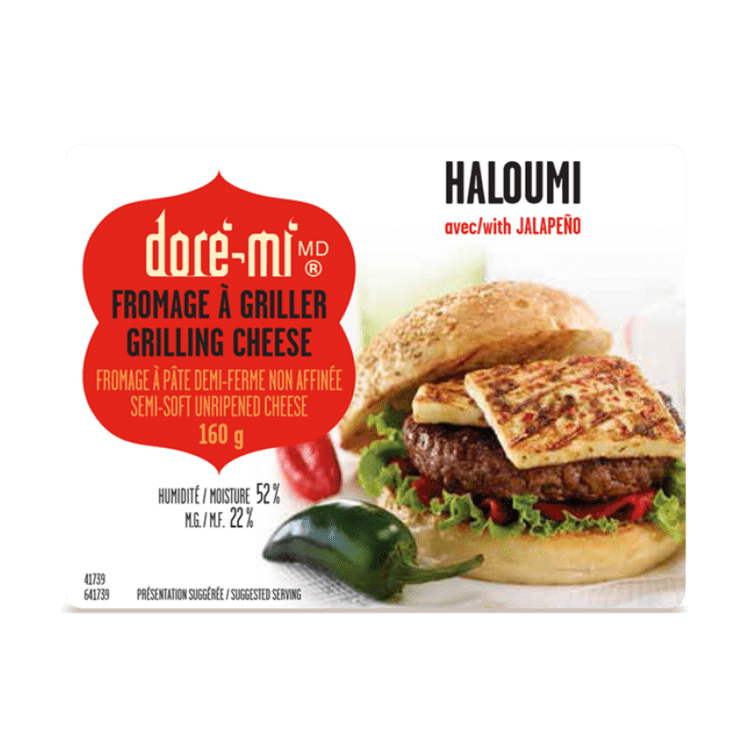 Fait de lait pasteurisé, le goût frais et salé de ce fromage non affiné à pâte semi-ferme sans croûte est discrètement relevé d’épices orientales et d’aromates exotiques. La pâte de ce haloumi est humide, homogène et légèrement caoutchouteuse. Le Doré-Mi est offert en format 160 g, et en différentes variétés, dont le régulier, aux épices méditerranéennes et aux épices indiennes.