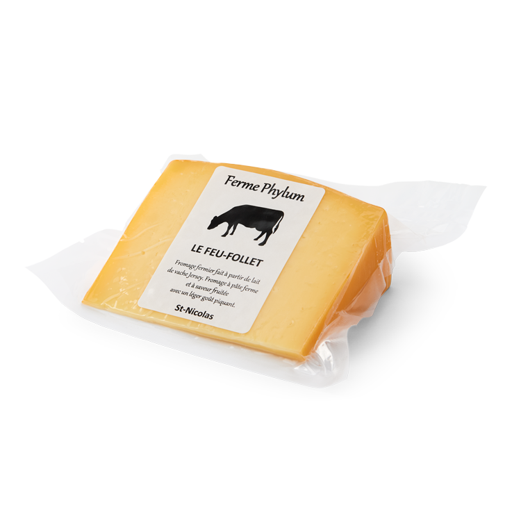 Fromage fait à partir de lait de vache Jersey, le Feu Follet possède une pâte ferme à saveur fruitée avec un léger goût piquant.