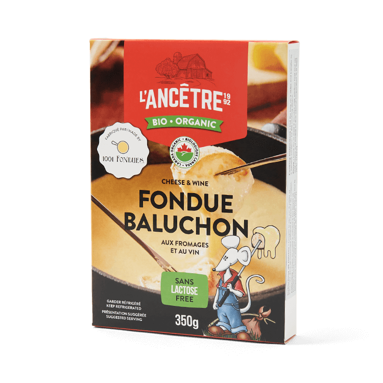 Cette savoureuse fondue biologique aux fromages et au vin blanc est un produit développé en collaboration avec 1001 Fondues. Elle est concoctée à partir d’un vin blanc biologique canadien et de trois fromages L’Ancêtre : le Baluchon, le Suisse et un mélange de cheddars vieillis.
