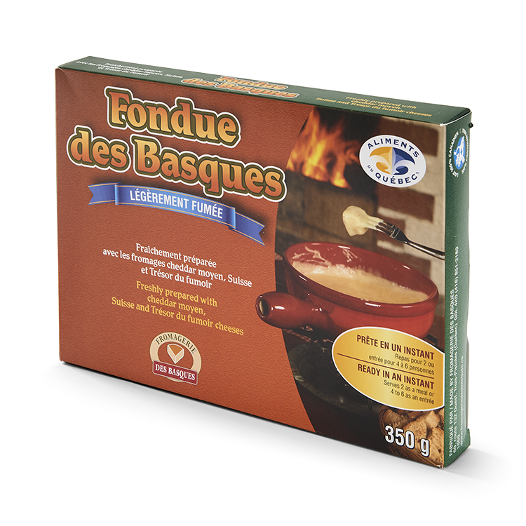 Cette fondue a été soigneusement conçue avec des fromages de la Fromagerie des Basques. À la différence de la Fondue des Basques traditionnelle, celle-ci est faite avec le fromage Trésor du Fumoir, un fromage fumé au bois d’érable. Dans le domaine des fondues prêtes à l’emploi, cette fondue légèrement fumée est une première. Elle se sert très bien en plat principal pour deux personnes ou encore en entrée pour quatre. Elle s’accompagne merveilleusement avec des viandes fumées. De plus, les pommes de terre grelots, les petits oignons surs ou encore les petits cornichons marinés se marient très bien avec les saveurs de cette fondue unique en son genre.