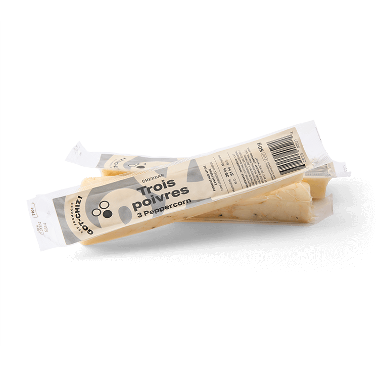 Fait de lait pasteurisé, ce fromage cheddar en bâtonnet aromatisé aux trois poivres est idéal en collation.