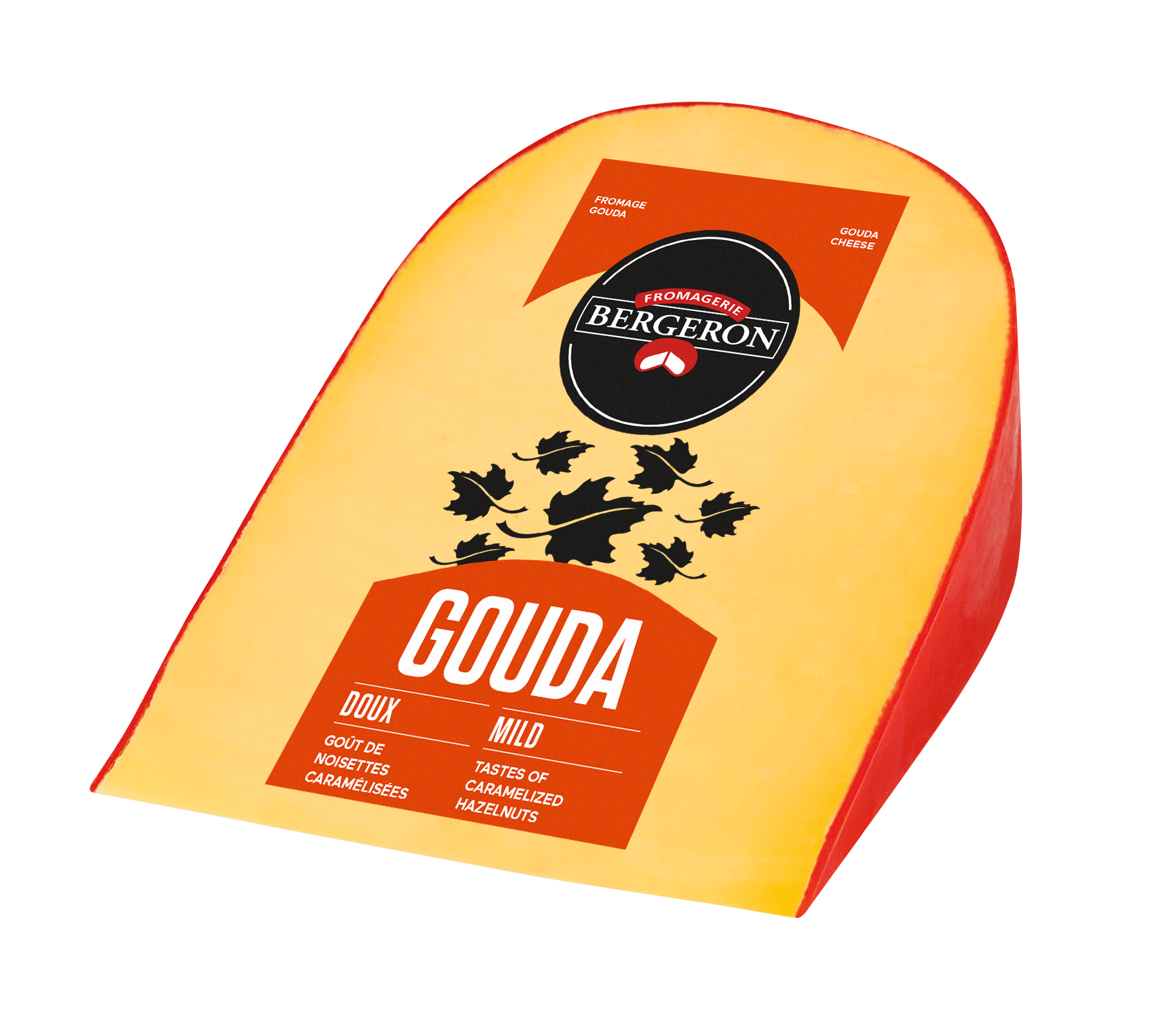 Ce fromage sans lactose à pâte ferme est fait de lait pasteurisé et possède une saveur de noisette légèrement acidulée. Élaboré selon la méthode hollandaise appréciée mondialement depuis plusieurs générations, le Gouda Bergeron est affiné 8 à 12 semaines dans la masse, sous une enveloppe de cire. Notons que la meule est enduite d’un enrobage alimentaire avant d’être plongée dans la cire; cet enrobage est comestible, mais il est conseillé de l’enlever pour ne pas altérer la saveur du fromage.