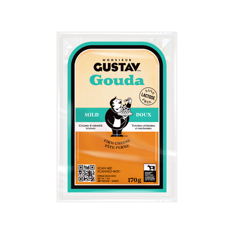 Fait de lait et de crème pasteurisés, ce Gouda Doux est un fromage sans lactose à pâte ferme pressée cuite, de couleur jaune crème et parsemée de petits trous. Avec son arôme variant de doux à marqué et sa pointe d'acidité, ce fromage possède un goût de crème et de noisette qui se savoure à toute heure de la journée.