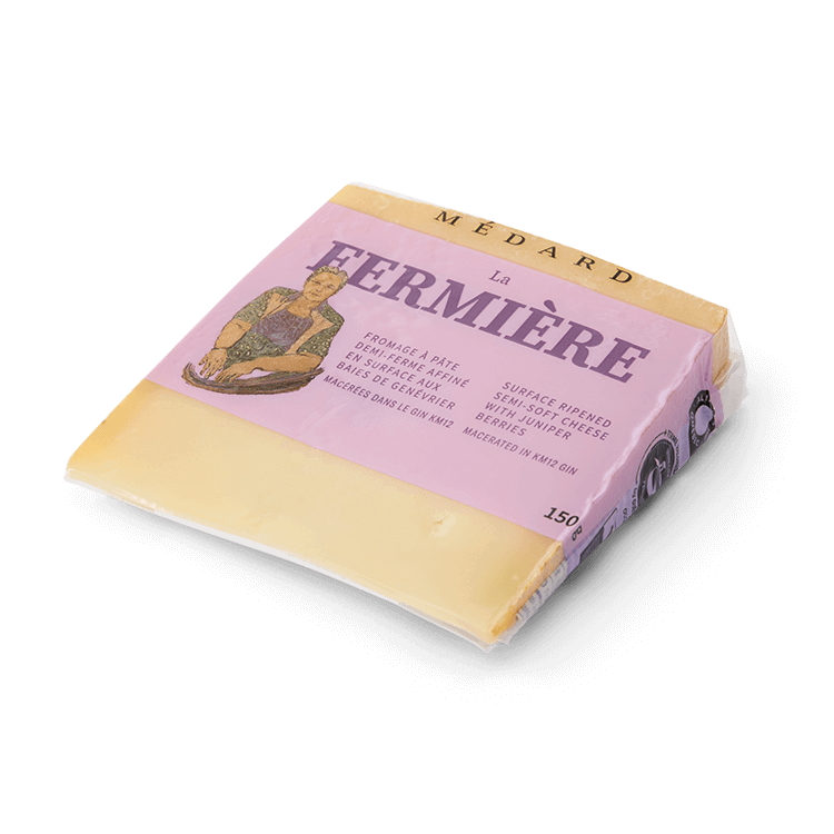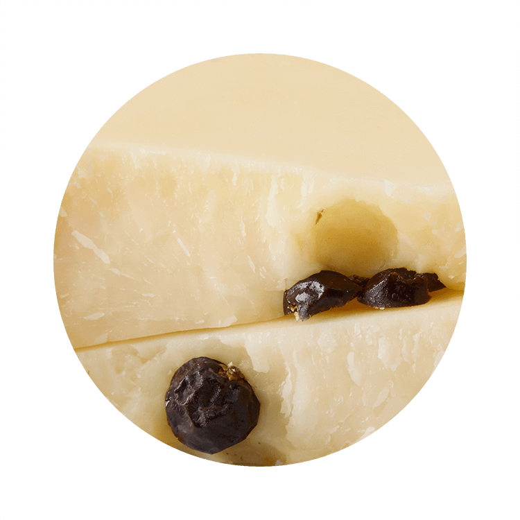 Fait de lait pasteurisé, ce fromage fermier à croûte lavée possède un parfum exquis de baie de genévrier. Les fruits visibles dans la pâte semi-ferme proviennent des jus de fermentation servant à l'élaboration du Gin km12 fabriqué dans la région. Ce produit unique est vieilli plus de 7 mois.