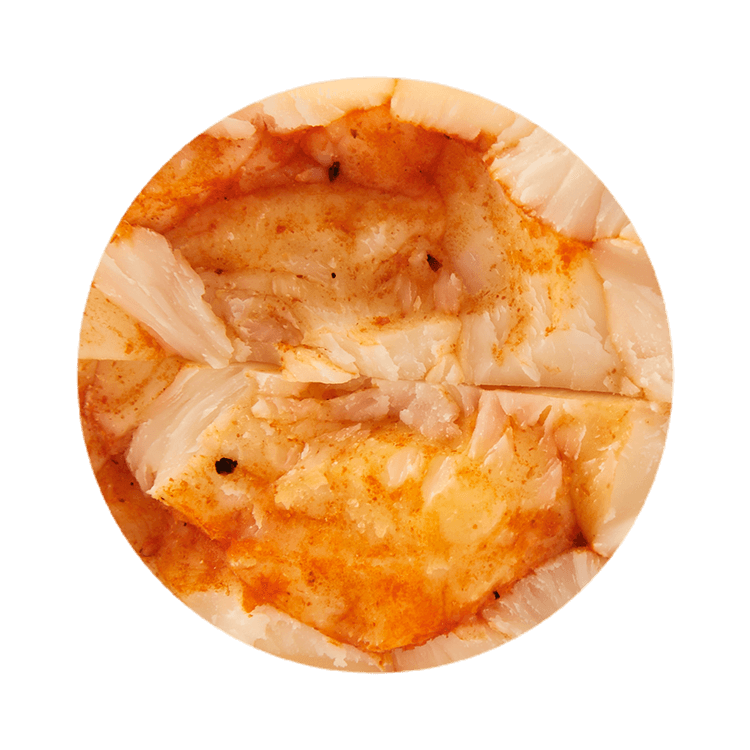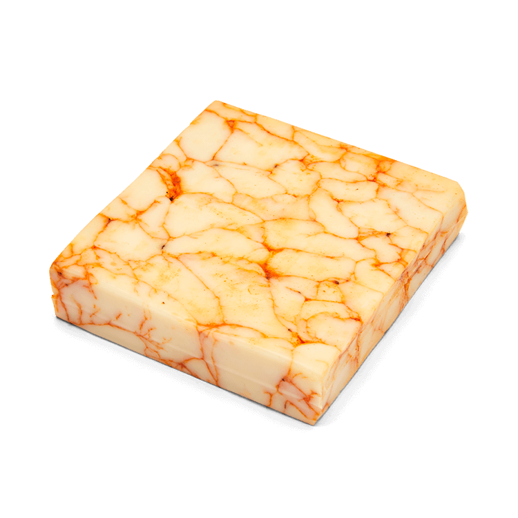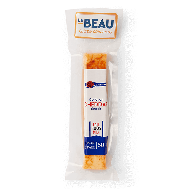 Ce fromage à pâte ferme sans croûte possède une pâte de couleur crème assaisonnée aux épices BBQ.