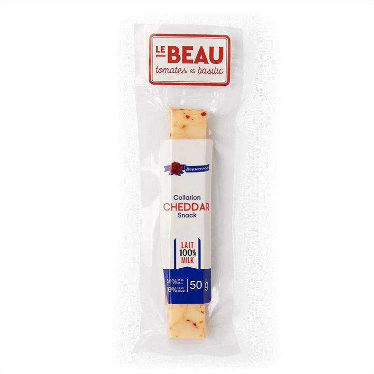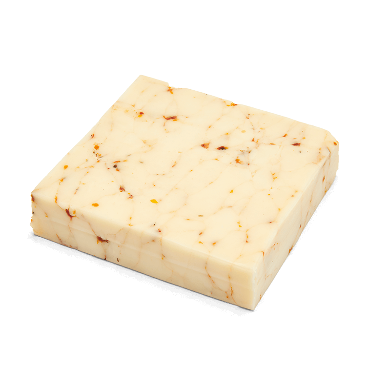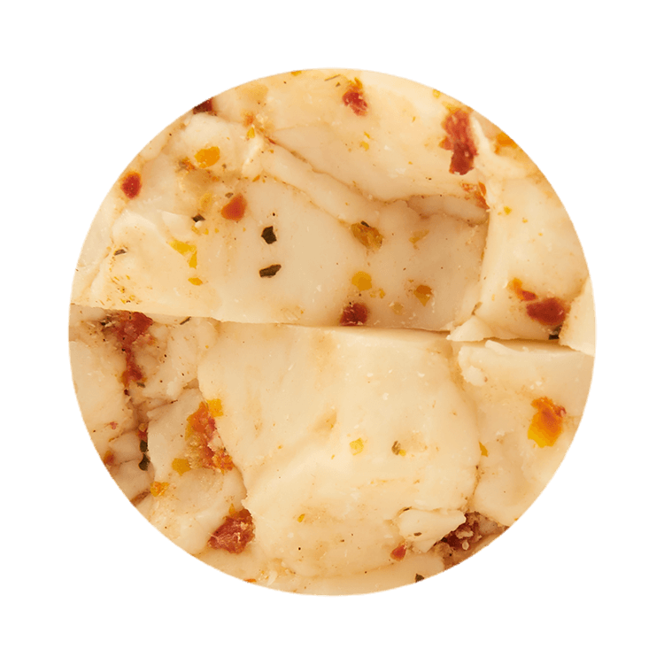 Ce fromage à pâte ferme sans croûte possède une pâte de couleur crème assaisonnée aux tomates et basilic.