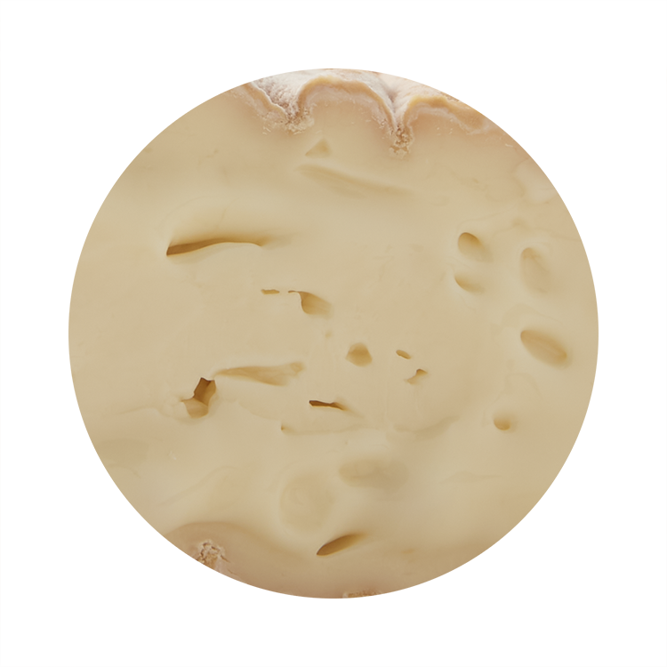 Ce fromage à pâte molle à croûte lavée est fait de lait entier pasteurisé provenant de vaches de race Jersey et de brebis du Terroir Témiscouata. Sa croûte orangée, collante et souple, est agrémentée d’un motif faisant ressortir sa confection purement artisanale. Occasionnellement, on y aperçoit quelques points de mousse blanchâtre. Lorsque le fromage est jeune, il possède une texture crémeuse et riche. Sa pâte présente quant à elle, une partie plus crayeuse au centre et plus lisse vers l’extérieure. Au fur et à mesure que le fromage progresse, la partie crayeuse s’estompe et la pâte devient lisse et coulante. Plus âgé, l’onctuosité de la pâte se traduit par une rondeur en bouche.