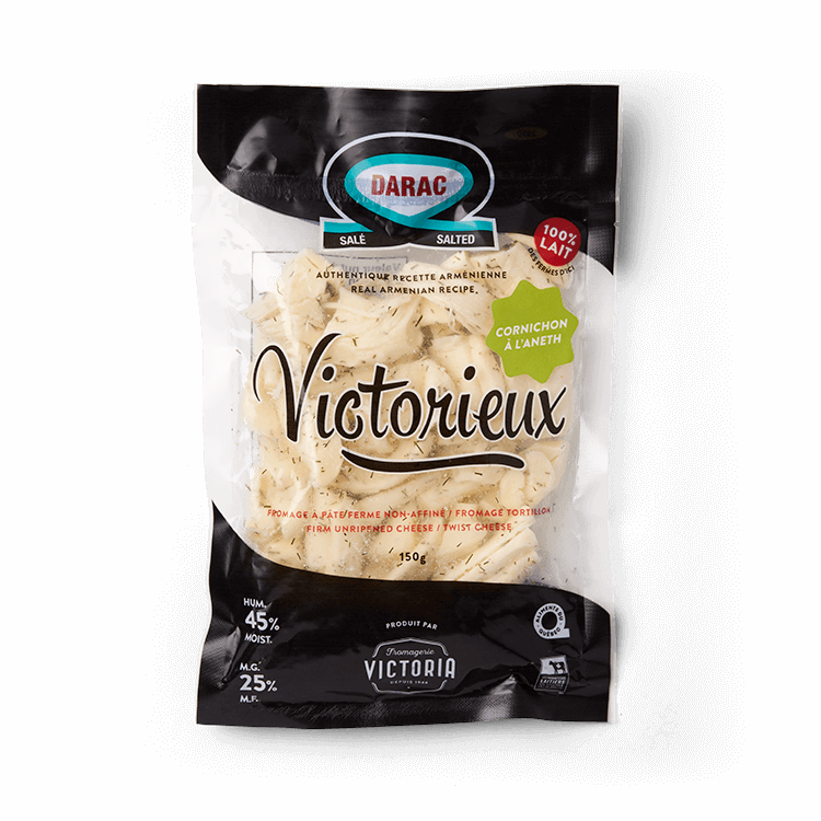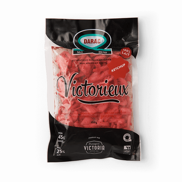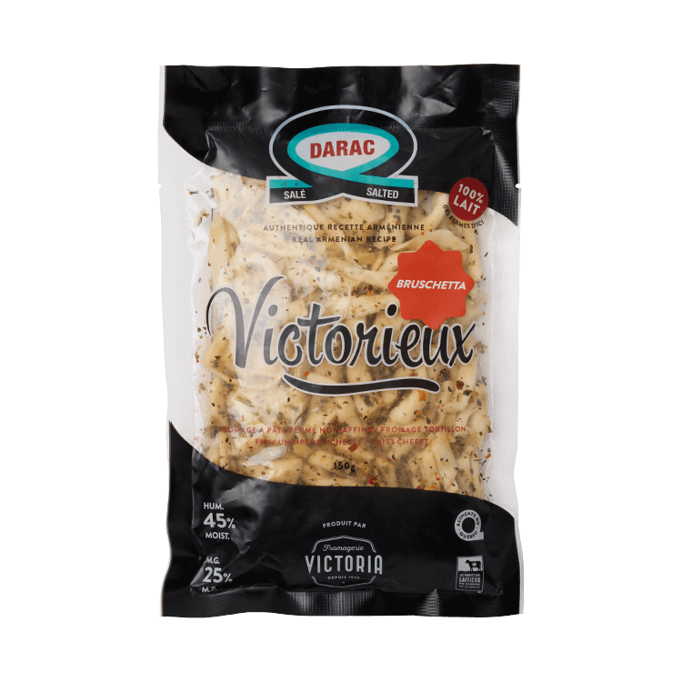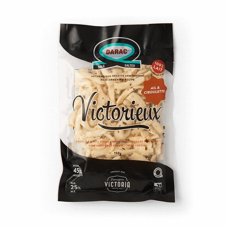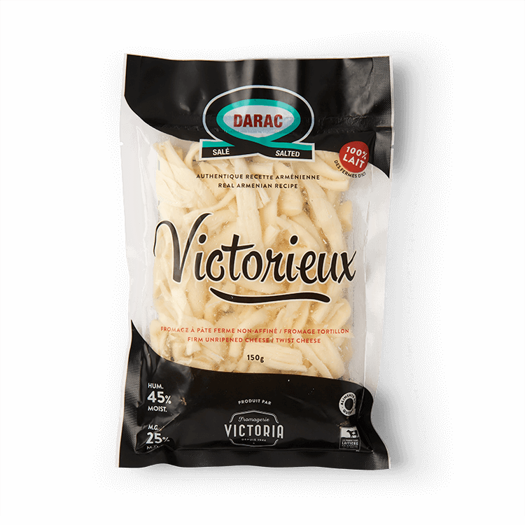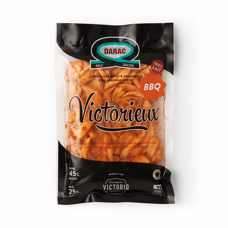 Les Victorieux au BBQ de la fromagerie Victoria sont fait de lait pasteurisé. Produit avec la recette authentique Arménienne. Particulièrement salé et relevé avec des épices BBQ, ils sont parfaits en collation.