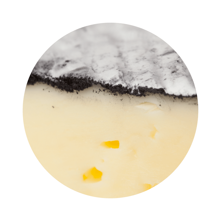 Ce fromage à pâte molle à croûte fleurie et cendrée est fait de lait entier pasteurisé, sans ajout de substances laitières modifiées. Sous sa croûte blanche légèrement feutrée par l’enrobage de cendres végétales se présente une pâte de couleur ivoire à la texture crémeuse et au goût de beurre aux notes de champignon.