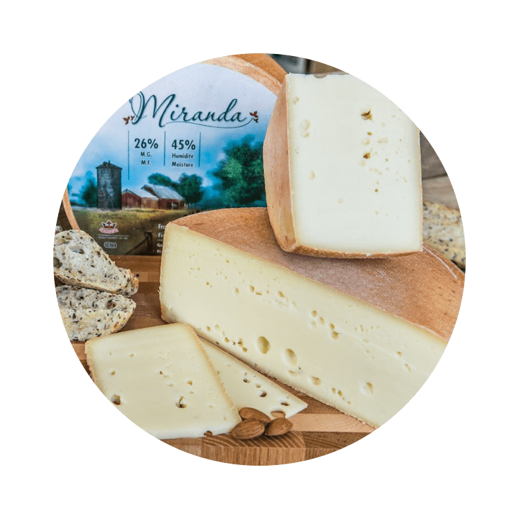 Ce fromage à pâte ferme à croûte lavée et brossée est fait de lait pasteurisé partiellement écrémé. De couleur rosée et cuivrée, la croûte est assez ferme, tout comme la pâte. Le fromage offre un arôme de noix, de fruit et de paille. La pâte, variant d’une couleur beige clair à jaunâtre, est peu souple et légèrement friable. Son goût salé comporte des nuances légèrement piquantes. La saveur du Miranda rappelle les noix, les amandes, le fruit et le beurre frais.