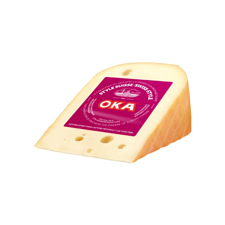 Ce fromage à pâte ferme parsemée de trous et à croûte lavée à la saumure est fait de lait pasteurisé. L'OKA Style Suisse est une nouvelle expérience gustative OKA qui marie le célèbre goût du OKA Original avec la saveur irrésistible et l'apparence distinctive d'un fromage de type européen avec trous. Le meilleur des deux mondes dans votre assiette !