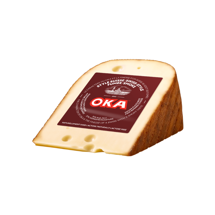 Ce fromage à pâte ferme de type suisse est fait de lait pasteurisé. L'OKA Style Suisse Fumée est une nouvelle expérience gustative OKA qui marie le célèbre goût du OKA traditionnel avec la saveur irrésistible et l'apparence distinctive d'un fromage de type européen avec trous. Maintenant à saveur de fumée. Une version régulière est également offerte.