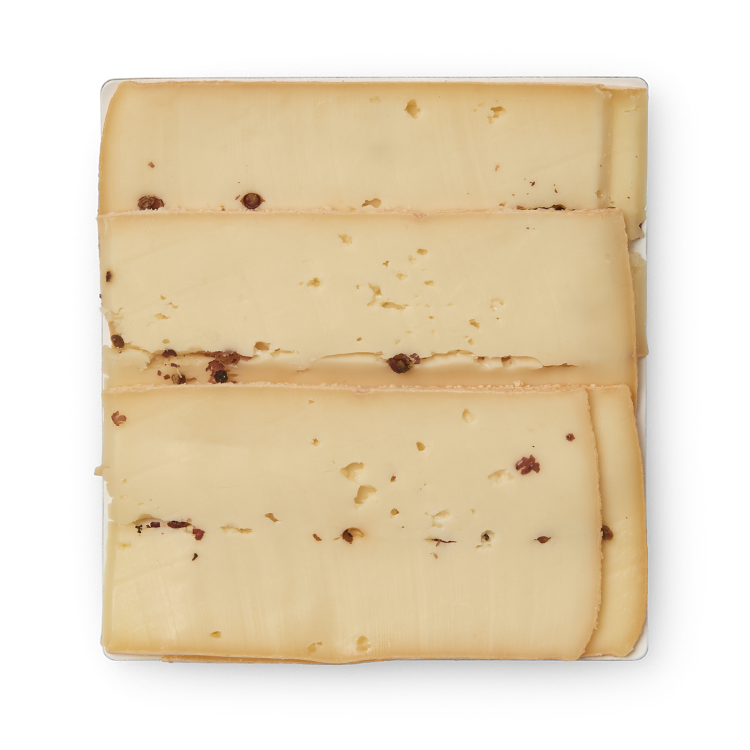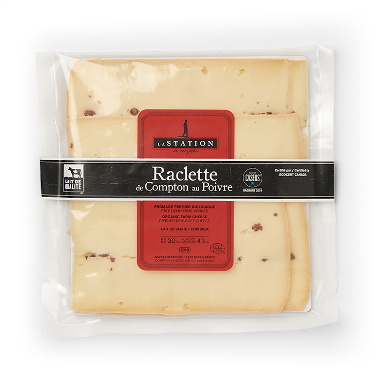 Affiné de 60 à 90 jours, ce fromage fermier biologique à pâte semi-ferme à croûte lavée est fait de lait thermisé provenant du troupeau de vaches Holstein de la ferme familiale. Sous la croûte cuivrée de la Raclette de Compton aux Poivres se présente une pâte ivoire et dorée à la texture souple et fondante en bouche. Il lui procure un goût plus relevé. Des grains de poivre rose sont intégrés au centre de la pâte et ils exhalent leur parfum sous l’effet de la chaleur.